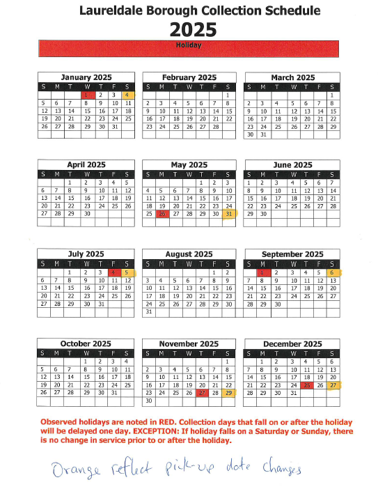 Trash/Recycling is always collected on Fridays. Collection Days that fall on or after the holiday will be delayed one day. If holiday falls on a Saturday or Sunday, there is no change in pick up days. Holidays are marked in red with their prospective collection day in orange. Trash/Recycling should always be placed at the curb the night before pick up day. Please call Borough Hall at 610-929-8700 if you have any questions.